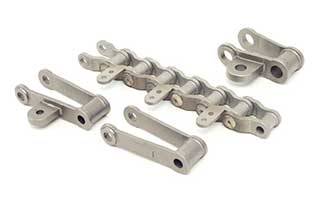 Pintle Chain, various styles available (not all styles shown). Tooling by Acra Cast (parts available to any customer). Common stainless alloys that these chains are ordered in: 304, 309, 316, and 330 (customer may select alloy of choice). Typical applications: High temperature brazing, sintering, heat treatment furnaces. Chain available either assembled or as loose links, with or without attachments.